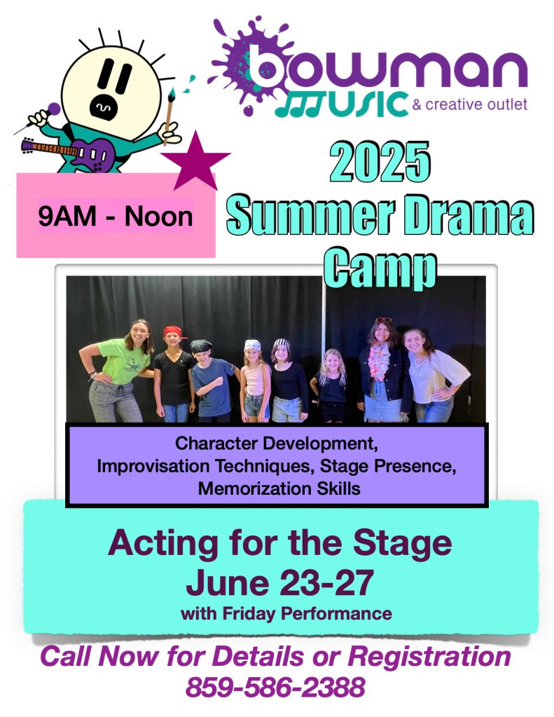 Theatre Arts Drama Camp is for those aged 8-16 who are interested in a more acting-intensive camp with focus on one-on-one scenes, extended memorization practice with monologues, introduction to the auditoning process and video auditions, and exploring the differences between on-stage and on-screen acting. The students will showcase their audition slates, scenes, monologues, and improvisation techniques at the end-of-week performance.